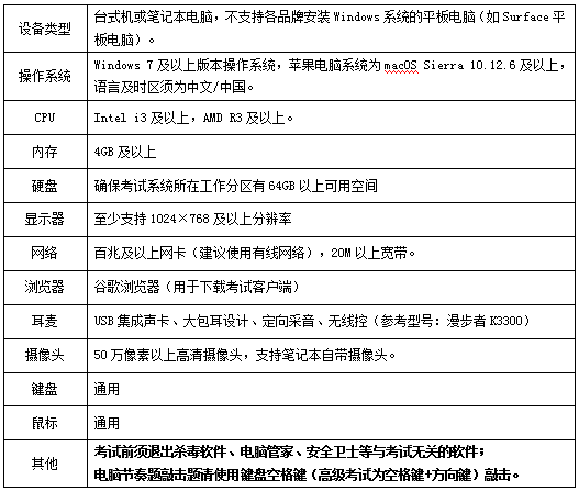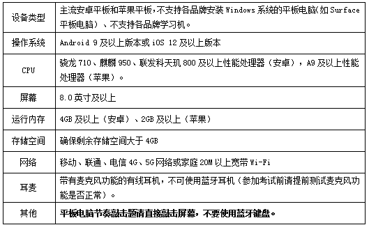 1.设备要求:考试支持计算机、Pad和手机3种设备类型,考生根据自身情况自备考试设备(至少1种),设备具体要求如下: